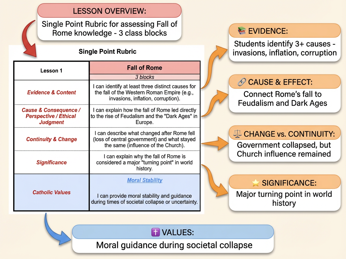 The "Fall of Rome" assessment rubric serves as our primary anchor, demonstrating how technology transforms abstract competencies into measurable success.